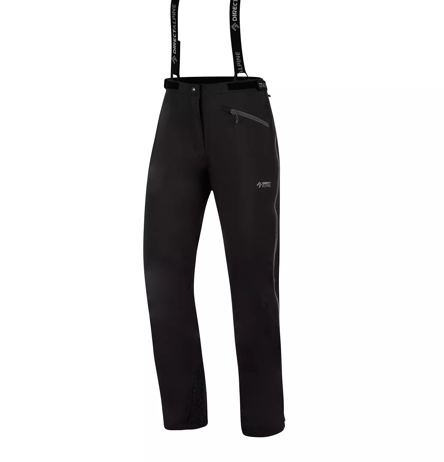 Water-repellent side zippers, asymmetrically inclined to the back, allowing ventilation, and for wearing pants without taking off boots.