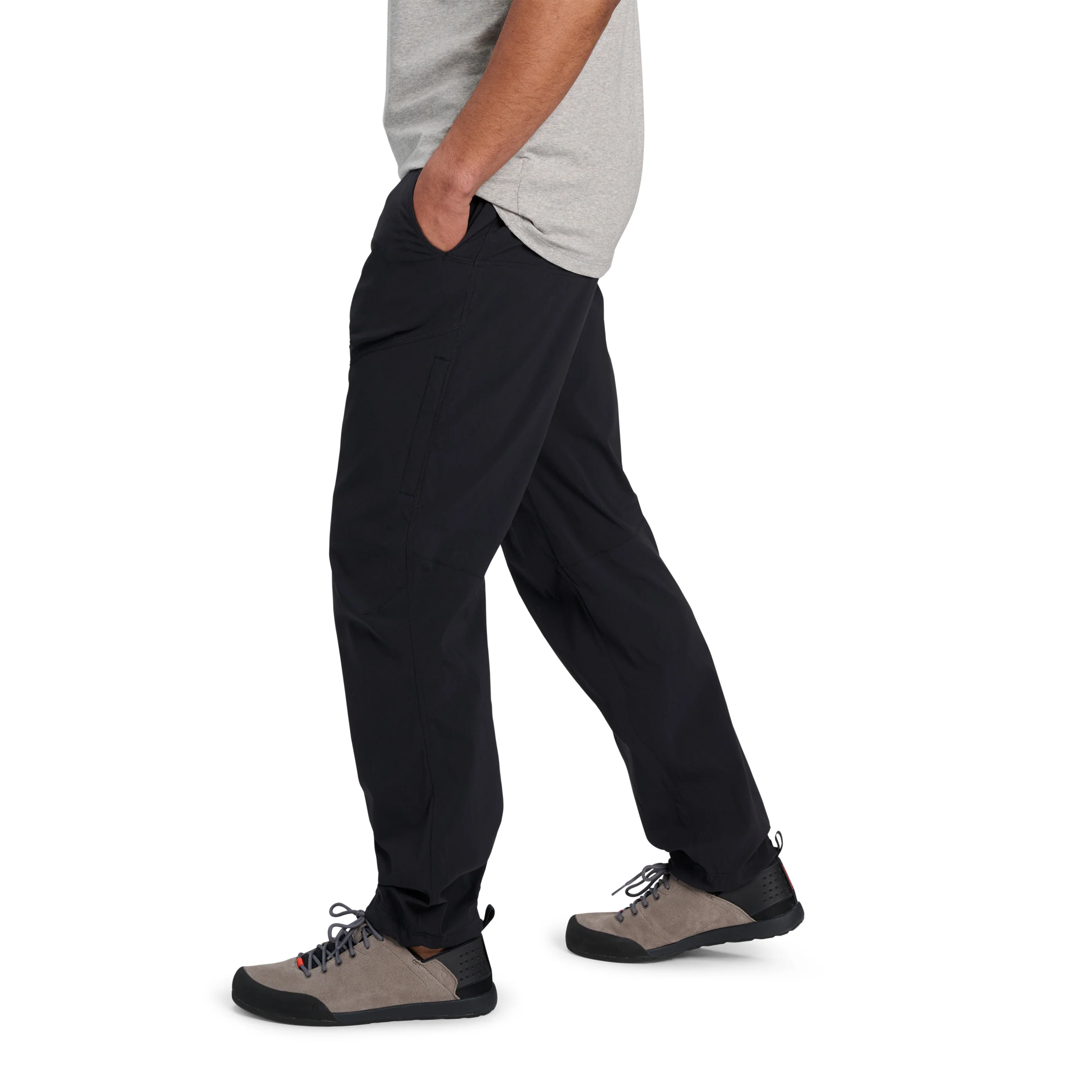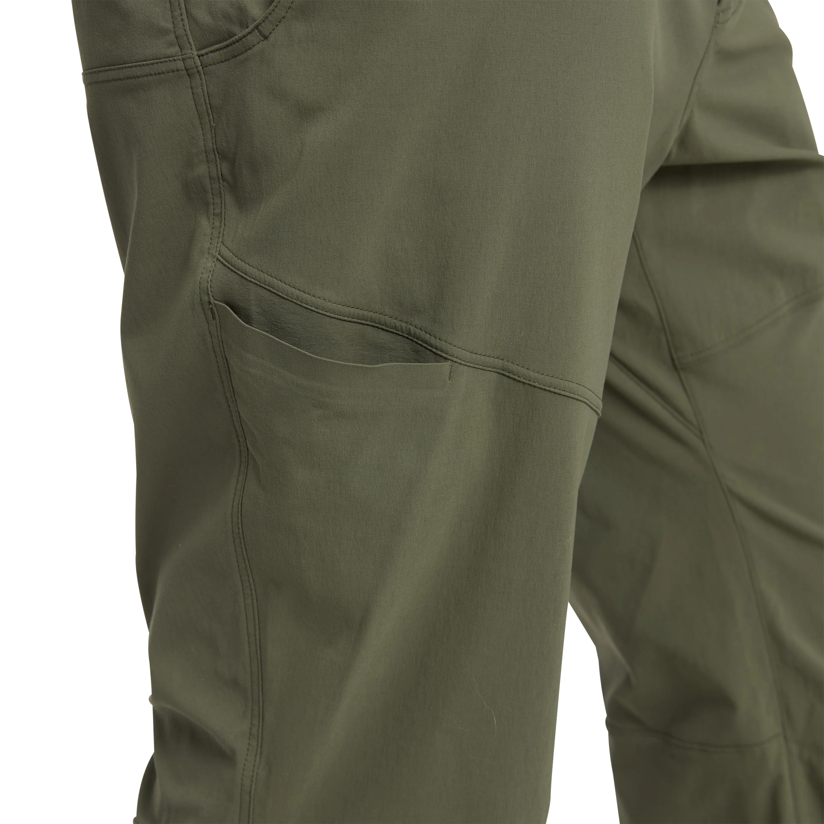 Activity‑driven features include a gusseted inseam and articulated knees to allow room for high‑stepping and boulder‑hopping, plus an adjustable bottom hem cinch that works for biking or climbing. A straight leg silhouette with practical pocketing rounds out the design, including two front drop‑in pockets, two rear pockets, and a zip thigh pocket for snacks or a phone.
