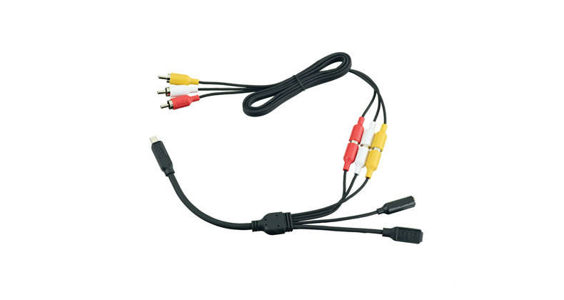 The Combo Cable connects through your GoPro camera's USB port, enabling composite video output, as well as 3.5mm mic input and USB connectivity.