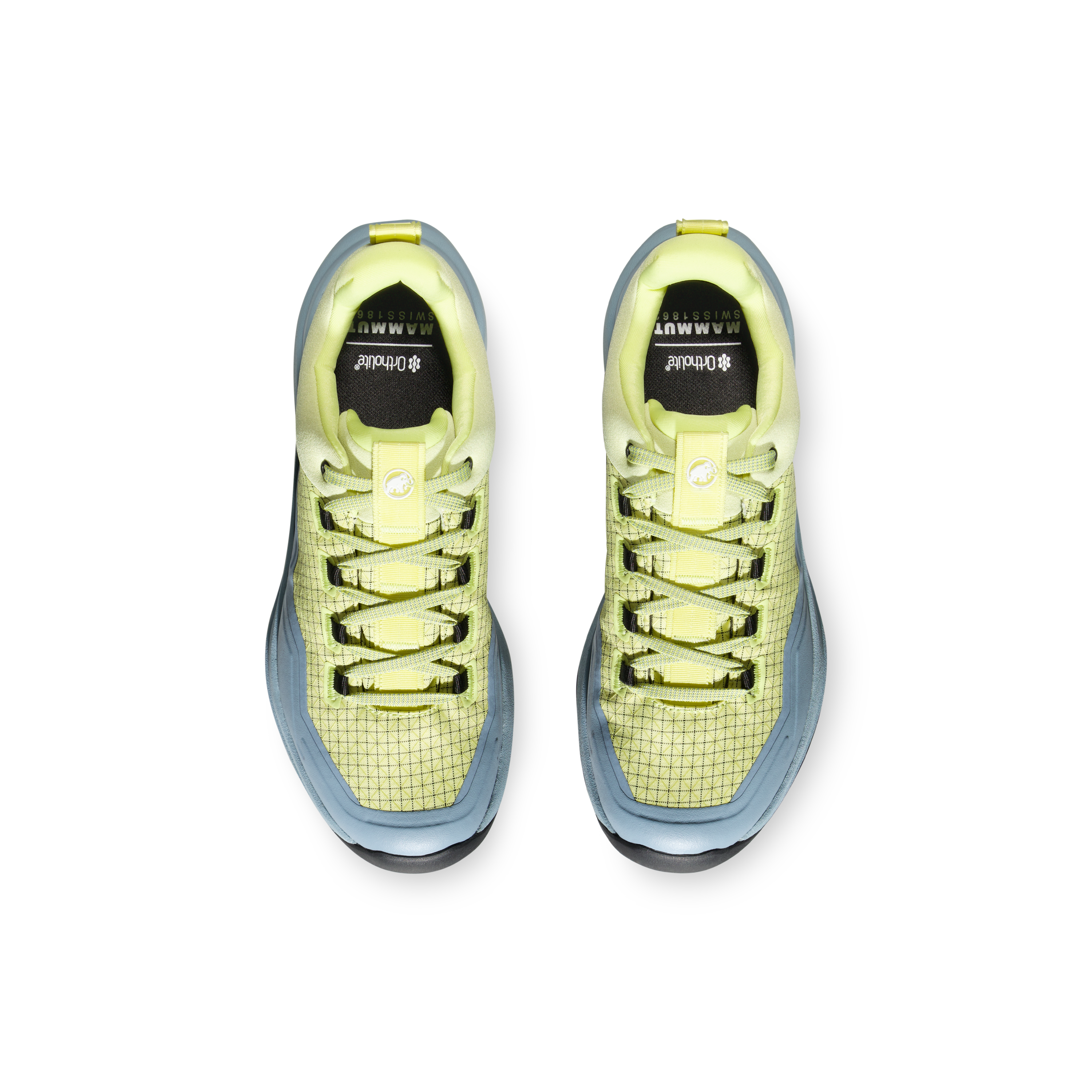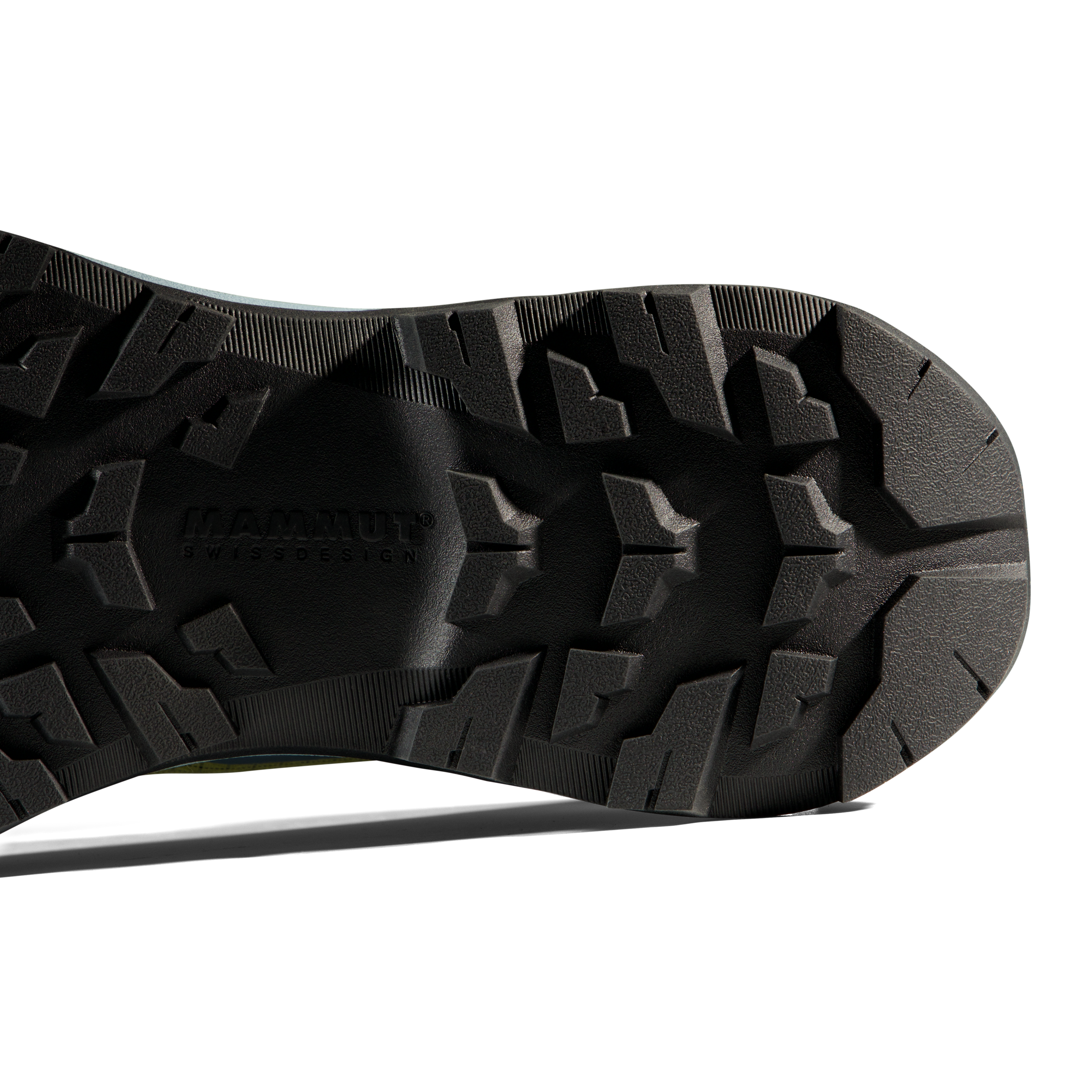 The upper is made from Double Layer Engineered Mesh, combining low weight with solid durability. The manufacturer also highlights an abrasion-resistant fabric upper and rubber rand, which improve protection and durability on rougher surfaces. The Mammut Swiss Design outsole is built for reliable grip in low temperatures, making the shoe a dependable option for mixed terrain and cooler conditions.
