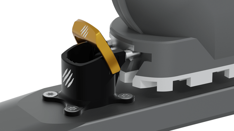 New swivel heel provides lateral and vertical safety release of ski-boot. For uphill mode, there is a flap on the heel with detent position to enable the higher walking mode/position of the boot.