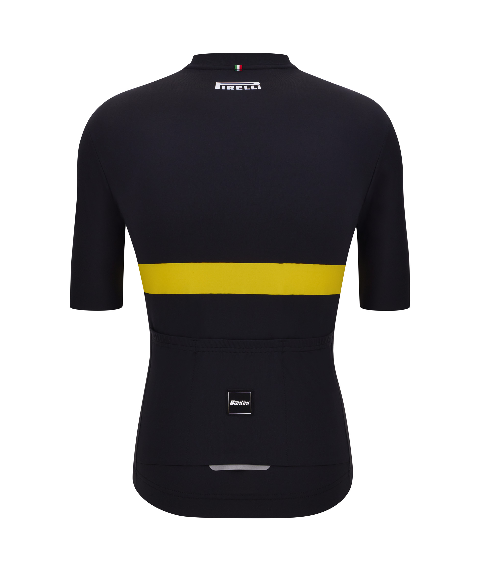 The triple back pocket makes this jersey ideal for longer rides and bike commuting. Certified UPF50+, the Pirelli SC jersey offers maximum protection against harmful UV rays, during long days spent under the sun. Gray reflective detail on the back of the jersey. Both Pirelli SC and Santini logos are applied as matte black silicone transfers. Inside the jersey, a label is sewn that tells the story of the Pirelli Sport Club.