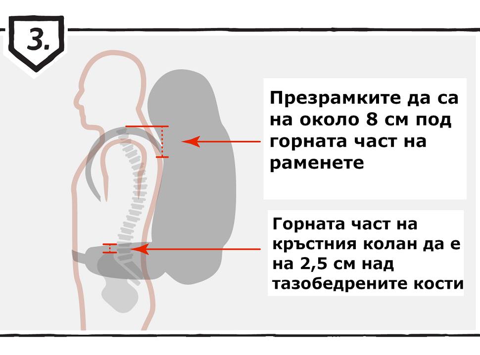 Когато изпробвате раницата на гърба си, не е лоша идея, ако е възможно да я напълните с поне 4,5 - 9,0 кг, за да симулирате реалните ѝ възможности. Най-важното нещо, което можете да направите е да се уверите, че горният ръб на кръстния колан е разположен на 2.5 см над тазобедрените ви кости. След това, презрамките трябва да стоят удобно на раменете ви и да са опънати, на около 8 см под горната част на раменете. Ако презрамката на раменете започне по-ниско от 8 см, опитайте по-голям размер.