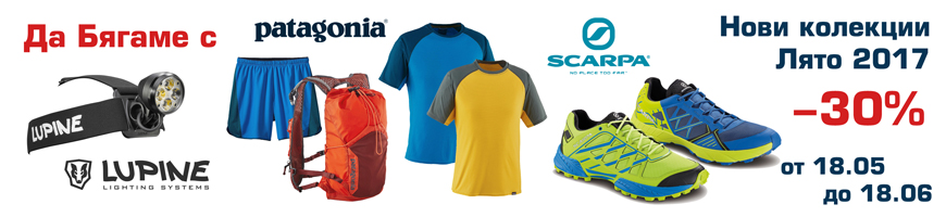 Даваме старт на сезона на бяганията със специално намаление на продуки за бягане от Patagonia, Scarpa и Lupine! Тениски, потници, шорти, раници и якета, създадени за нуждите на бягащите, маратонки за планинско бягане и челници за безкомпромисно осветяване на пътя - всичко това сега може да вземете с -30% намаление!  В парка, планината или градските алеи - предизвикваме ви - спрете с извиненията и тичайте! Очакваме ви на адрес Черни връх 90, Стамболийски 46, както и онлайн.