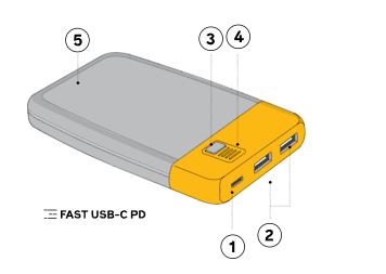 OUTPUTS: 1x USB C-PD, 2x USB A