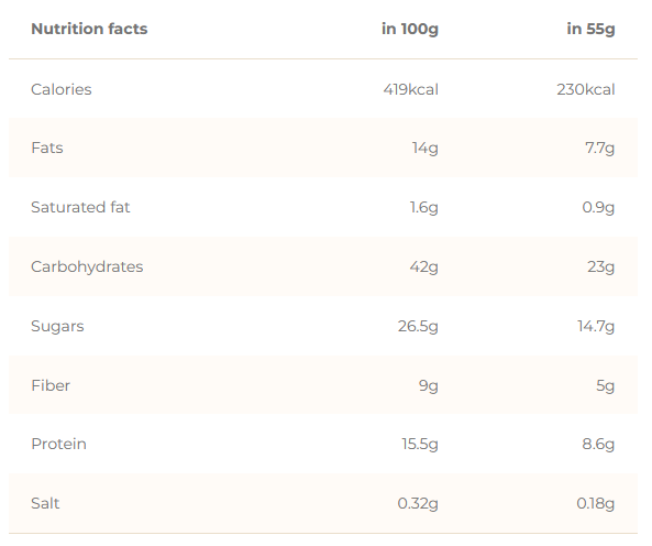 Składniki: syrop ryżowy, płatki owsiane, chrupki ryżowe (mąka ryżowa, cukier, syrop glukozowy, 4% kakao w proszku, ekstrakt słodu jęczmiennego, sól),mąka z soczewicy, czekolada * 9% (masa kakaowa 46%, cukier, masło kakaowe 10%, emulgator: lecytyna sojowa),oleje roślinne (palmowe, shea),substancja utrzymująca wilgoć: gliceryna, migdały, kolor: karmelowy, aromat, sól. * kakao: co najmniej 55%.