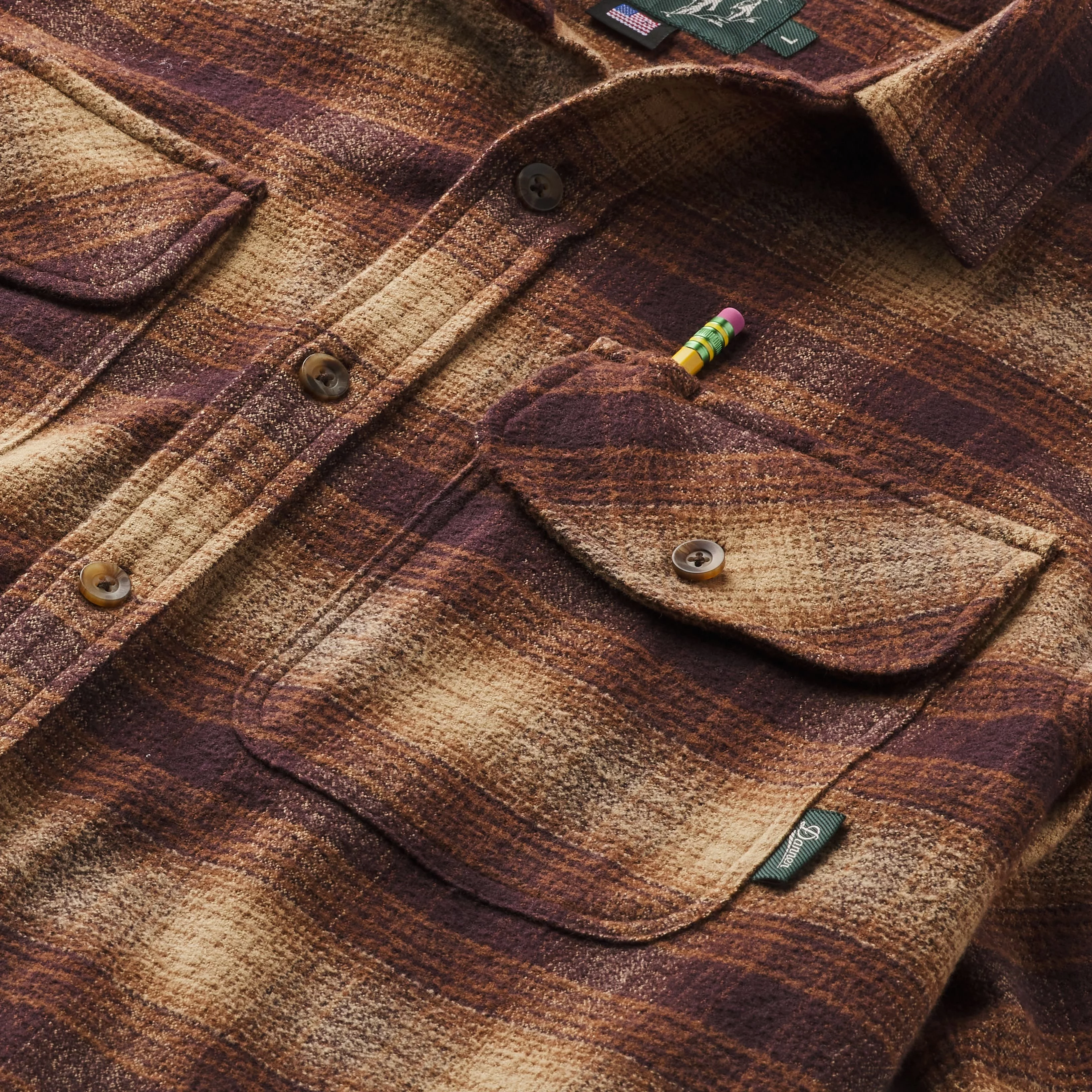 Pockets: Two button-flap chest pockets with pen/sunglass slot