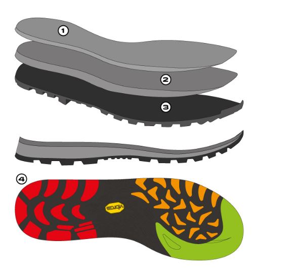 Vertical Dual Density Sole with Vibram® Megagrip compound + moulded midsole with micro sole in two densities with differentiated thicknesses.