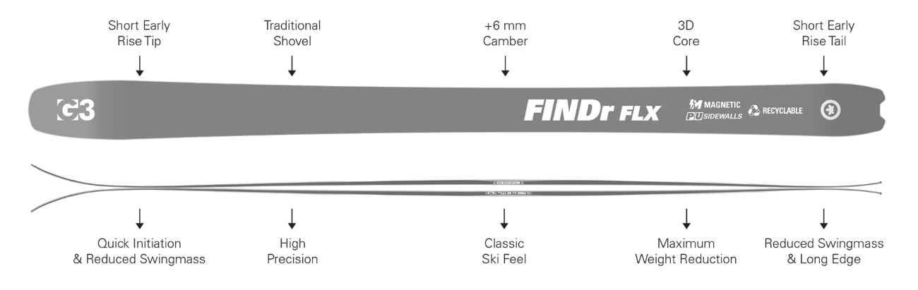 Конструкцията от стъклени влакна и полиуретановите странични стени преобразяват обичаната форма на FINDr 94 в високопроизводителен ски за 50/50 употреба, както в рамките на пистите, така и извън тях, като подобряват издръжливостта и здравината му. FINDr 94 FLX е отличен избор за скиори на средно ниво, които търсят добро представяне, но не искат да плащат за карбон.
