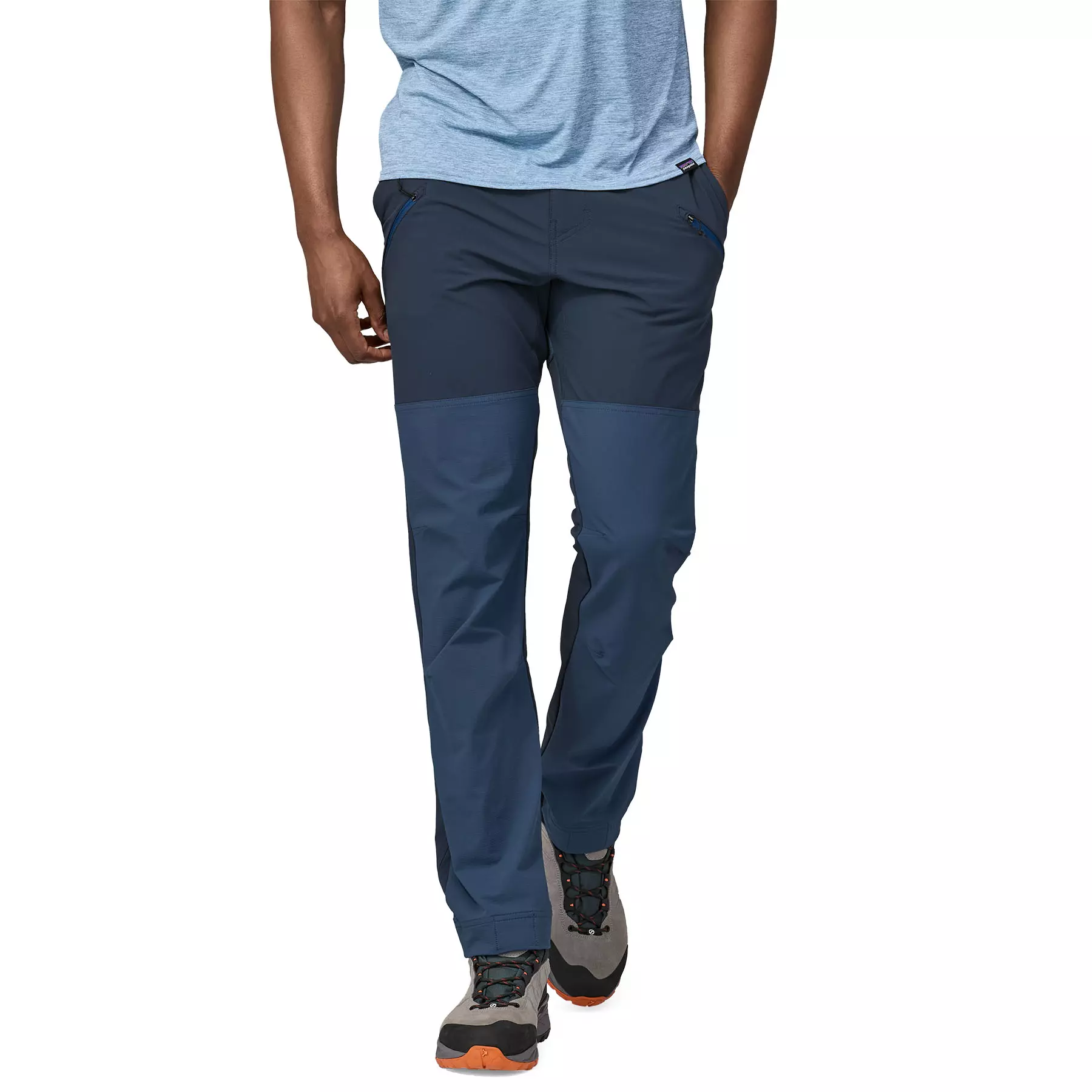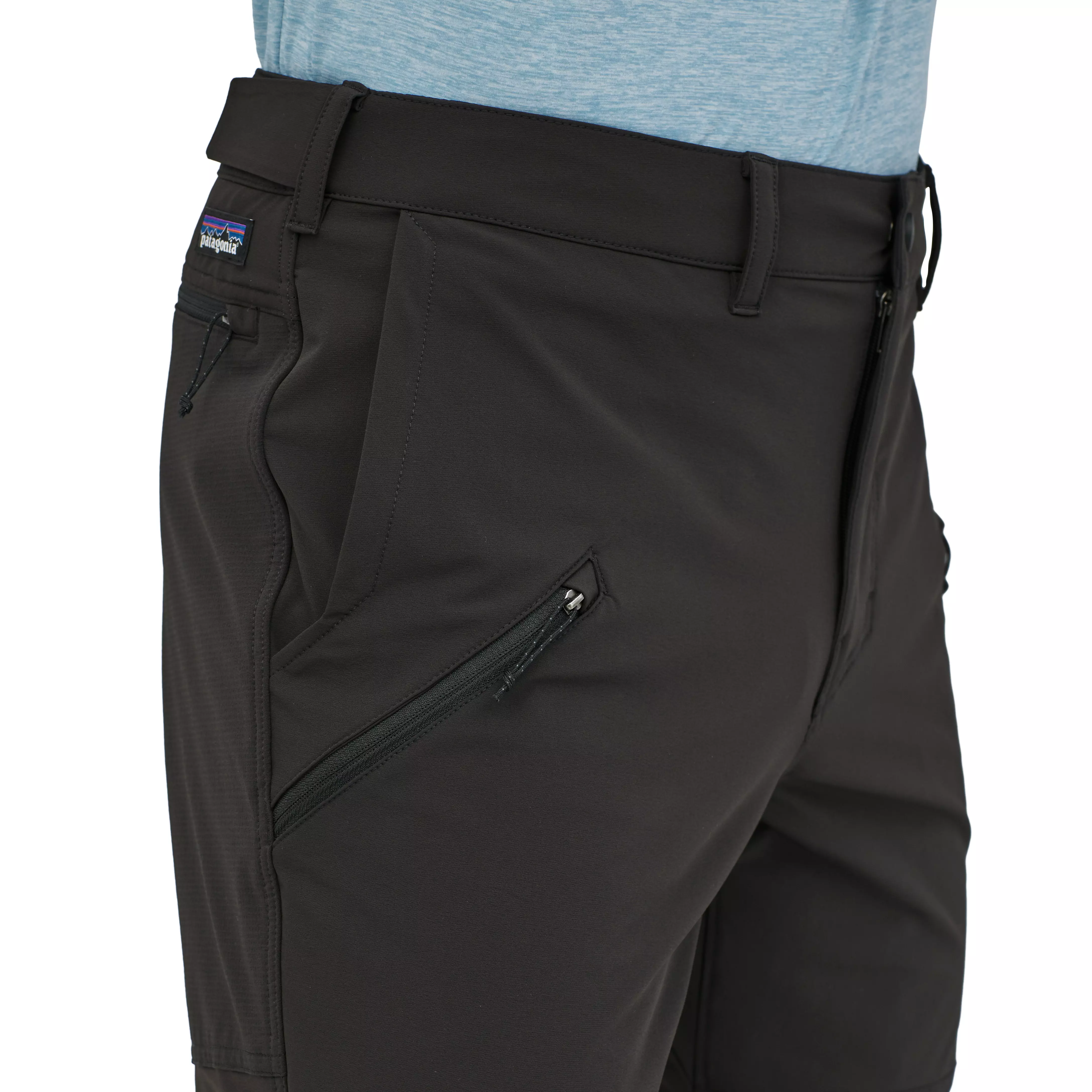 Mitered on-seam front pockets with drainage; two zippered thigh pockets with drainage; two zippered back pockets
