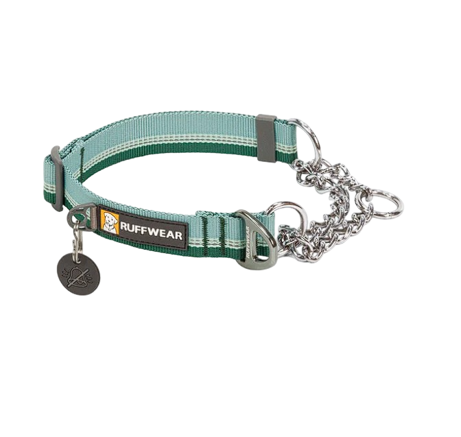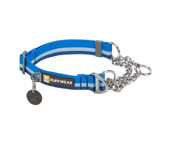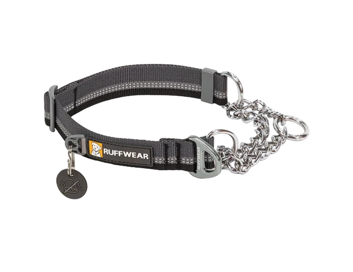 The Chain Reaction Collar is a martingale collar with chain. It combines reflective Tubelok™ webbing and a short section of stainless steel chain. The limited-cinch martingale design is popular among dogs who have a knack for slipping out of traditional collars. Packed full of Ruffwear’s signature collar features: separate ID tag attachment point, a silicone tag silencer, and strong and comfortable webbing that holds its color.