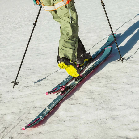 The lightweight Karuba wood core combined with a full carbon weave provides strength and stability without unnecessary weight, making ascents easier and descents more responsive and fun. The tip and tail rocker enhances float and turn initiation, while the flat tail and medium flex deliver reliable edge hold and control in mixed snow conditions.