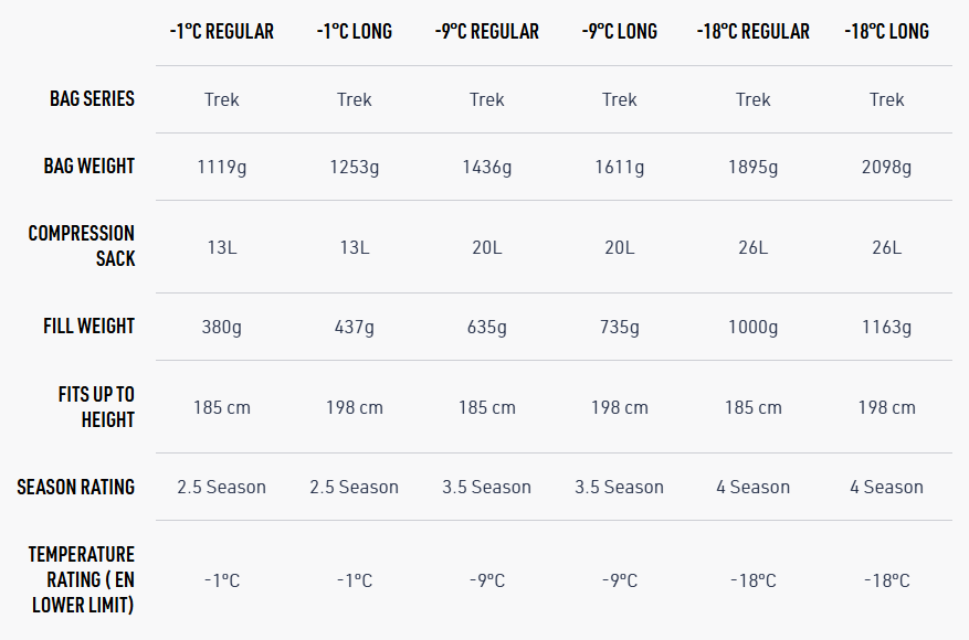 • Shaped hood and oversized zip draft tubes (Trek -12°C also has a draft collar, fits snugly around shoulders) to seal in warmth and keep cold out